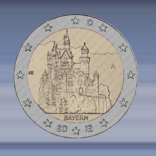 Neuschwanstein Bayern. Leverbaar letter (A) (D) (G) (J) de 2 EURO munt is verpakt in een zelfklevende munthouder.
