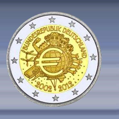 10 Jaar Euro. leverbaar letter (D) (F) (G) (J) de 2 EURO munt is verpakt in een zelfklevende munthouder.