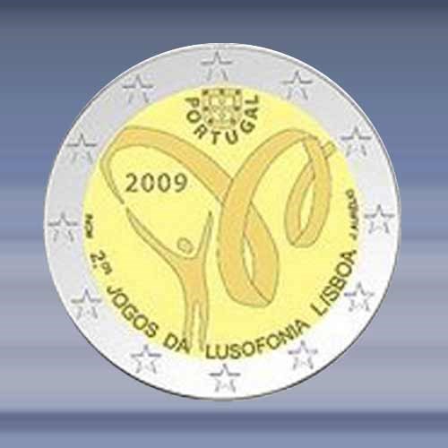 Lusofonia de 2 EURO munt is verpakt in een zelfklevende munthouder.