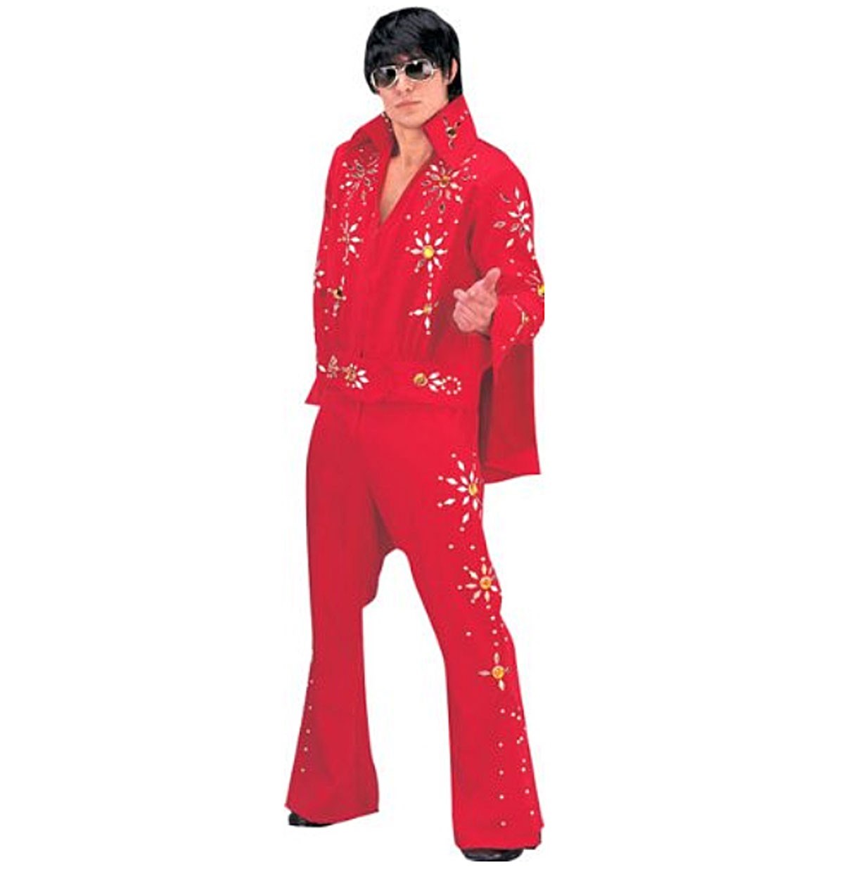 Prachtig driedelig Elvis jumpsuit in rood. Handgemaakt en bedekt met meer dan 900 gouden applicaties. Pak is volledig gevoerd en komt samen met een afneembare cape en riem. Gemaakt van een 100% hoge kwaliteit polyester/katoen mix.