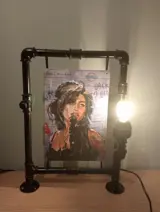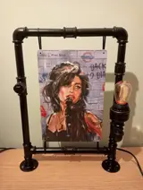Te koopIndustriële handgemaakte steampunk lamp met daar in hangend een retro bord van Amy WinehouseAfmeting : Lengte 46 cm , Breedte 32 cm