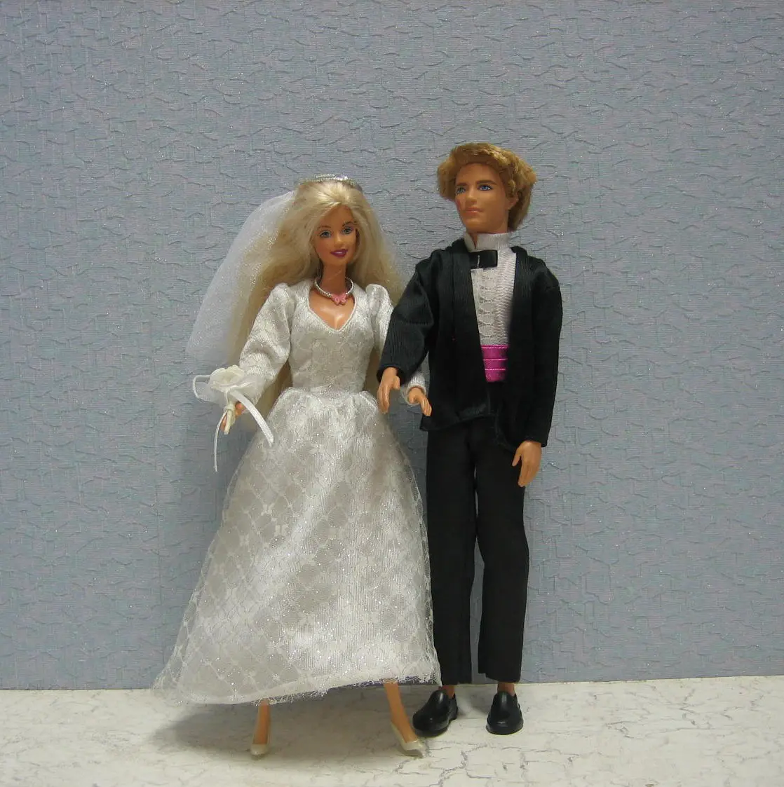 Barbie en Ken gaan trouwen met bruidstaart en een taartschep en een bijzettafel.