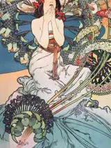 Mucha, geboren in Moravië, verhuisde in 1887 naar Parijs en werd plotseling de meest prominente illustrator in Parijs met de poster die hij per ongeluk ontwierp voor Sarah Bernhardt in Gismonda.