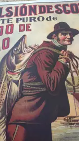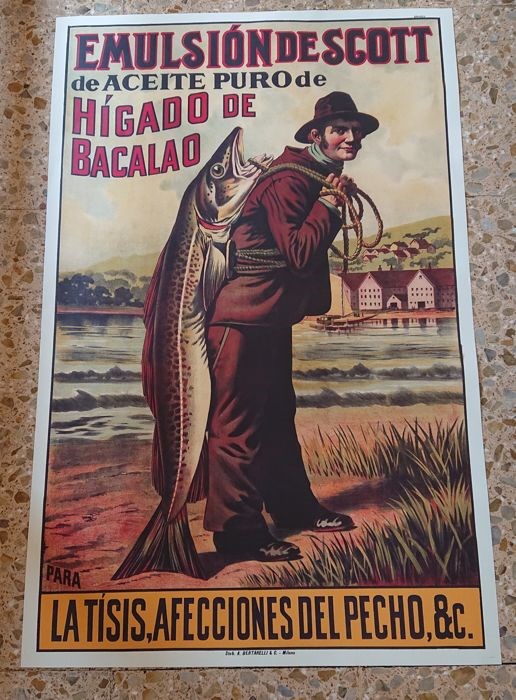 Poster van het klassieke Scott-emulsiemedicijn. Het is een grote poster met een afmeting van 100 x 70 cm. Het stelt een Noorse of Scandinavische visser voor met een kabeljauw op zijn rug. Het is een poster die identiek is aan het productlabel. Een geweldige poster die bij veel mensen veel jeugdherinneringen zal brengen.