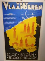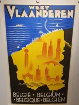 Zeldzame originele jaren 1930 Art Deco affiche uitgegeven ter promotie van de provincie West-Vlaanderen. Met alle belangrijke bezienswaardigheden zoals oud casino Oostende, Belfort Brugge, Menenpoort,...