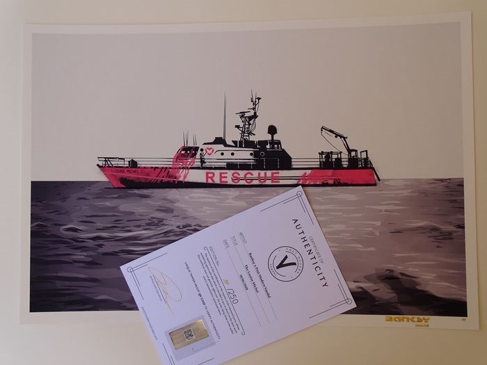 "The Louise Michel" print herdenkt Banksy's nieuwste kunstwerk en betrokkenheid bij de M.V. Louise Michel-project. Elke afdruk is voorzien van een handtekening van Banksy Vandalized, met de hand gestempeld in zwarte Delicata-inkt, reliëfstempel, en wordt geleverd met een certificaat van echtheid met het verificatiesysteem van Legitly, zodat je altijd weet dat het echt is.
