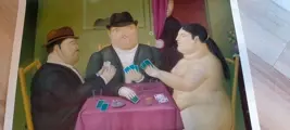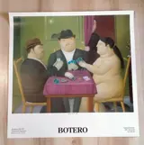 De poster reproduceert een olieverf op canvas schilderij van Botero getiteld "De kaartspelers" uit 1991.