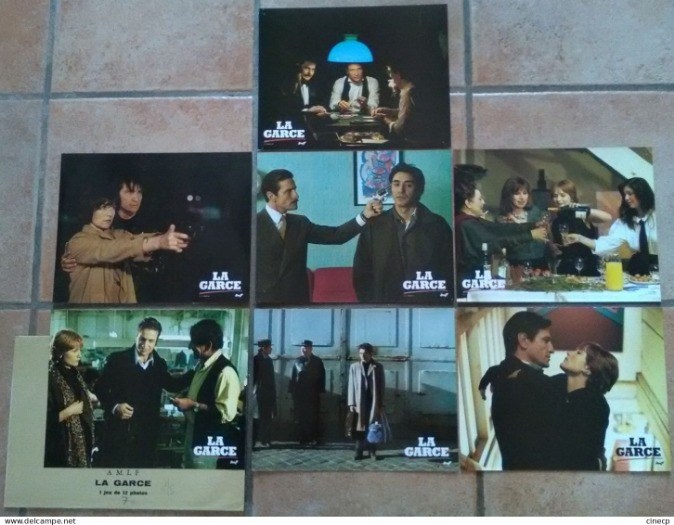 ORIGINELE inkomplete FRANSE filmfotoset( bioscoop vitrine foto 's ) van 7 st. in een gebruikte staat( pinholes/tape resten achterkant ) en het formaat van 27,5 x 21 cm.