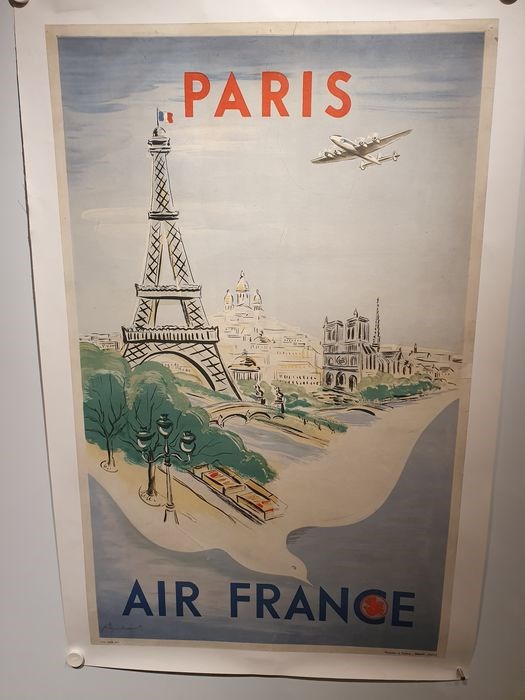 Zeldzame originele Air France poster uit 1950 voor Parijs. Zeer aantrekkelijke affiche. 62x100cm.