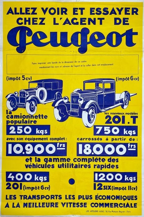 Affiche ”Allez voir et essayer chez L'agent de Peugeot” uit begin jaren dertig.
