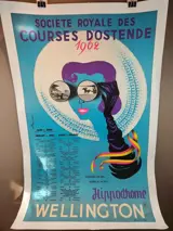 Originele zeldzame affiche voor de paardenkoers van Oostende editie zomer 1962. Naar een ontwerp van Willy Bosschem. De affiche is op linnen en in goede staat. Rechtsonder wat gevlekt.