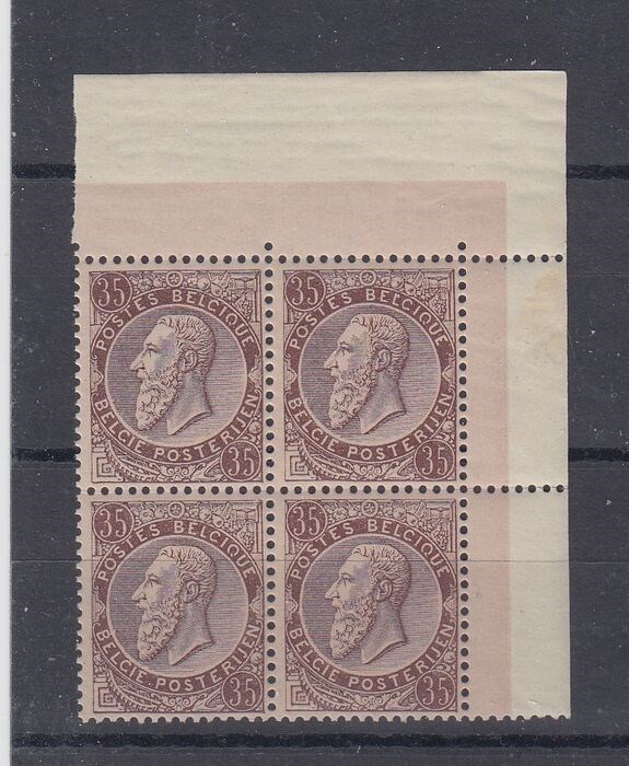 België 1884 - Leopold II - OBP 49 in blok van 4 in bladhoek met zeer goede centrage