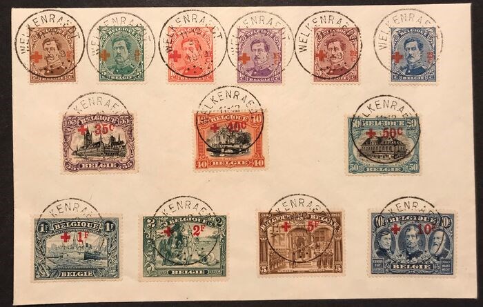België 1918 - Uitgifte Albert I en uitzichten - Rode Kruis - Volledige reeks op Document - Gestempeld WELKENRAEDT - OBP 150/163