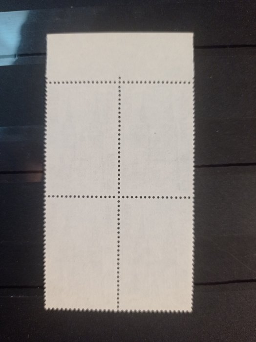 Blok van 4 met zeldzame curiositeit, de bovenste 2 zegels quasi zonder paarse hemel, de 2 onderste gedeeltelijk, nog nooit gezien op veiling of dergelijke, uniek.