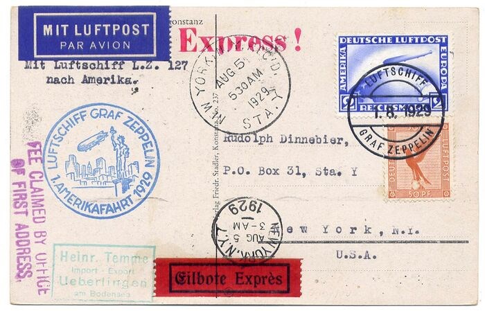 Gefrankeerd met de schaarse blauwe 2 reichsmark zeppelin luchtpostzegel en extra 50 Pfg