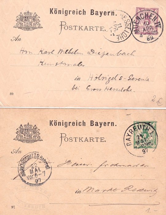 Oud Duitsland - Beieren. 1873-1919. Zeer goede en uitgebreide verzameling postwaardestukken van P 1. Met enkele dubbels. In totaal 47 stuks. Gestempeld. De postwissels zijn ongebruikt. Verschillende meestal goede staat.