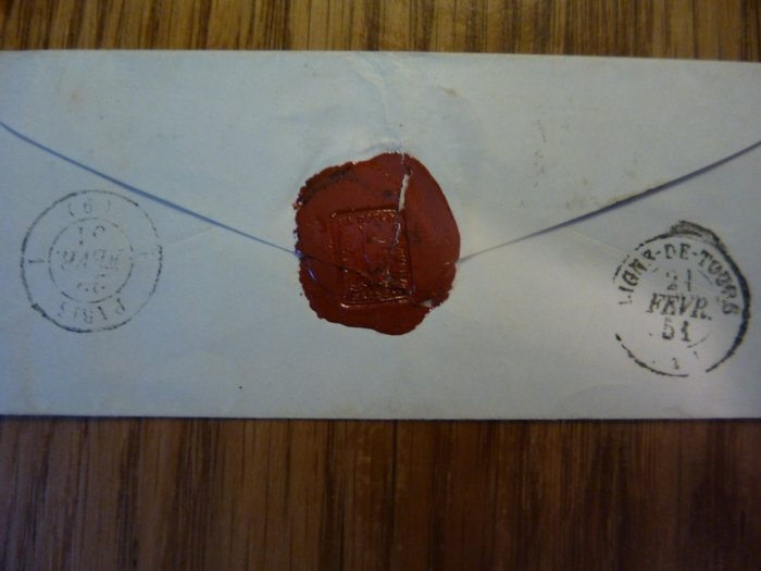 Vier postzegels uit Savernay (42), waarvan er twee een lakzegel hebben om te bestuderen. Vier anderen uit Nantes