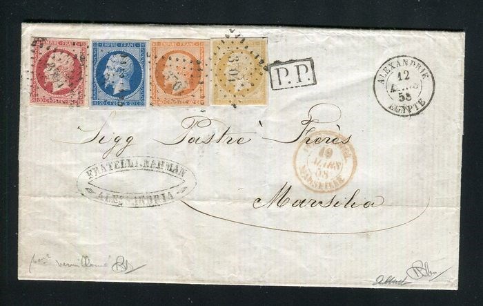 Extreem zeldzame brief met correspondentie verzonden vanuit het Franse kantoor van Alexandrië naar Marseille in driedubbele frankering, met een vierkleurige frankering met nr. 13Aa - 14A - 16 & 17Ad Vermilioned