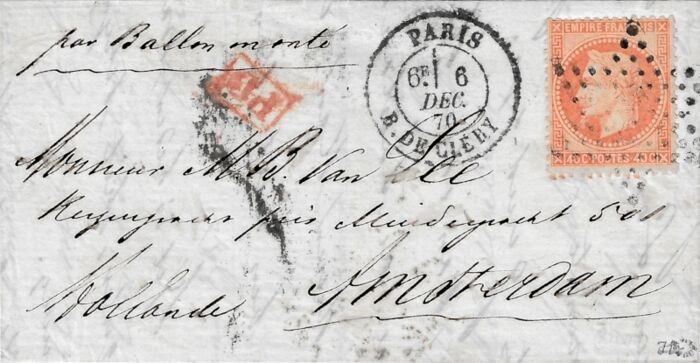Empire Lauré 40 centimes oranje, gestempelde ster 24 op brief met correspondentie naar Amsterdam. Op de voorzijde de cad van Parijs rue de Clery op 6 Dec 70.