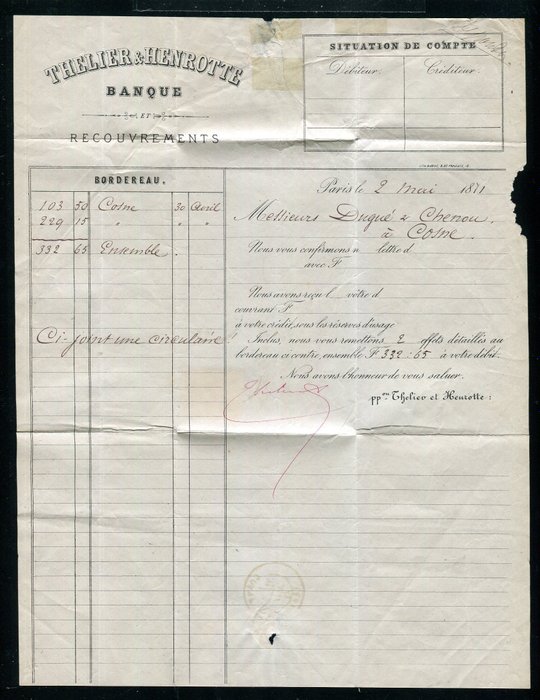 Zeldzame brief met correspondentie verzonden tijdens de opstand van de Commune van Parijs op 2 mei 1871, op 3 mei door een koerier op het kantoor van Versailles gepost en op 4 mei in Cosne aangekomen