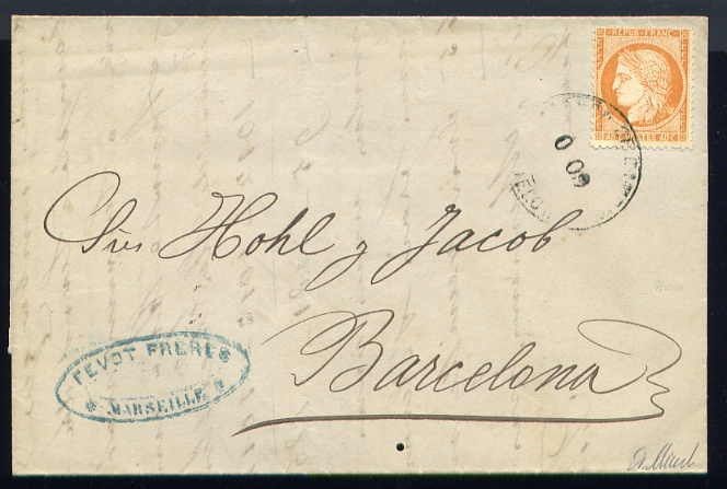 Zeldzame brief met gezant van Marseille voor Barcelona (Spanje) met een nr. 38 en parfait état, oblitéré du cachet Admon de Cambio 9 Centimos