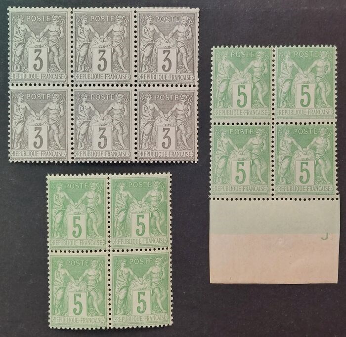 Frankrijk 1880/98 - ‘Sage’ type, lot with 3 blocks of 4 - Yvert 87, 102 et 106