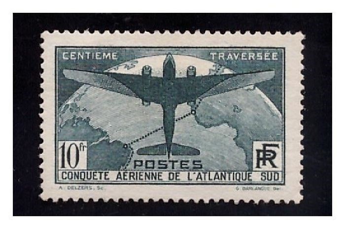Mythische en zeldzame postzegel uit 1936 '100th Aerial Crossing of the South Atlantic', 10 Fr in donkergroen, Yvert no. 321.