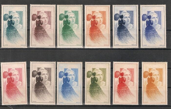 Zeldzame COMPLETE serie van 12 "Marianne de Gandon" postzegels uitgegeven tijdens de 1949 Postage Stamp Centenary Exhibition in Parijs.
