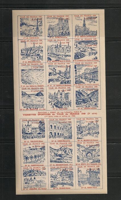 Schaars en mooi blok van 21 verschillende labels uitgegeven in 1949 en gewijd aan de etappes van de Tour de France.