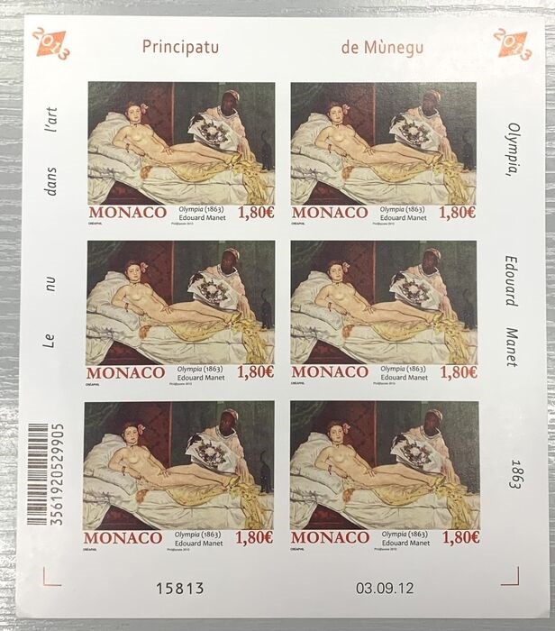 Monaco 2012 - €1.80 Olympia by Édouard MANET, imperforate in sheet of 6, superb and rare - Yvert & Tellier n° 2857