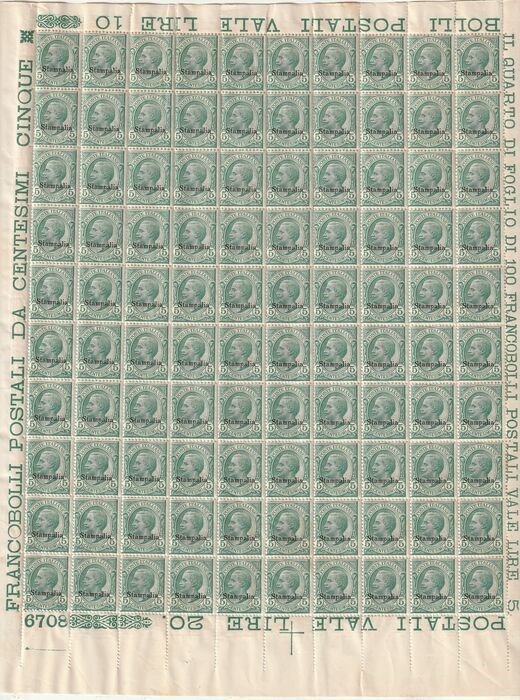 Italiaanse Egeïsche Eilanden - Stampalia 1912 - 5 c. green, sheet of 100 with plate number 6708 with full margins, intact - Sassone n.2