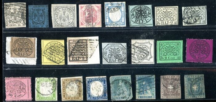 24 waarden van de verschillende staten. Materiaal van uitstekende tweede keus. Genoemde mooie kleuren en eerlijke waarden (Modena Dagelijkse portokosten 5 zonder gom, Pontificio 80 ingesprongen variëteit 31c, Sardinië 5 cent 13Ad, Toscane nr. 15, 20b. Goede set met hoge cataloguswaarde.