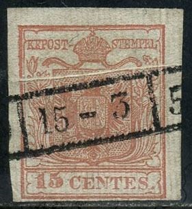 Italiaanse oude staten - Lombardije Venetië 1851 - 15 cents with vertically ribbed paper. Bellows fold prior to the print. With certificate. - Sassone N. 15a