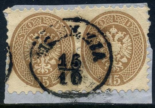 Italiaanse oude staten - Lombardije Venetië 1864 - Coat of arms, 15 cents brown, perforation 9.5, cancelled pair in Venice on small cut out. - Sassone N. 45