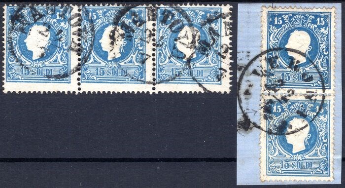 Italiaanse oude staten - Lombardije Venetië - 2nd issue – 2nd type – 15 s. used vertical pair on cut out + horizontal strip of 3 - Sass. n° 32