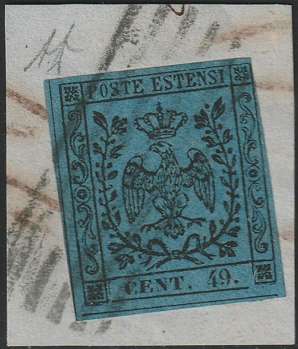 Italiaanse oude staten - Modena 1852 - 40 c. dark azure, variety CENT. 49. (9 instead of 0) used on fragment, rare and certified - Sassone n.10a