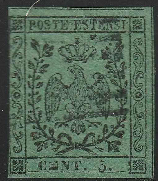Italiaanse oude staten - Modena 1852 - 5 c. green, variety lying E of CENT, used, great rarity, certified - Sassone n.7l