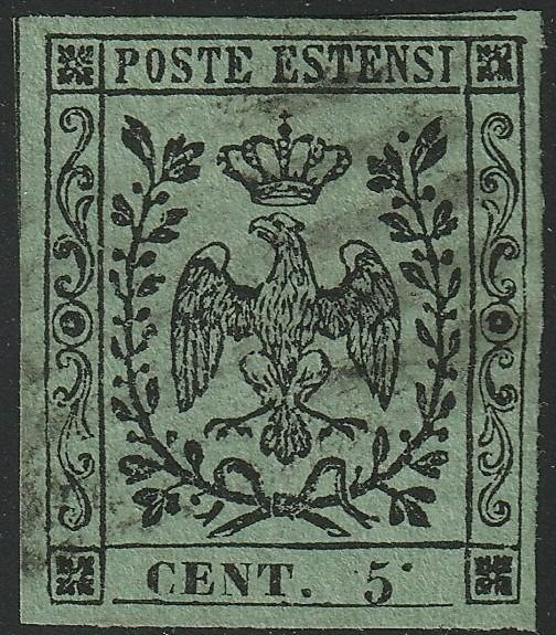 Italiaanse oude staten - Modena 1852 - 5 c. olive green, variety with dot at the top after 5, rare and certified - Sassone n.8b