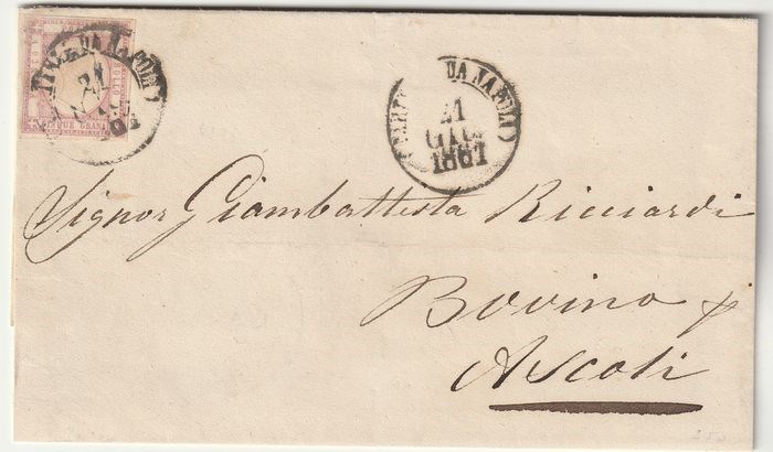 Italiaanse oude staten - Napels 1861 - 5 gr. lilla ben marginato su fresca sovracoperta da Napoli x Ascoli rara - Sassone n.21c