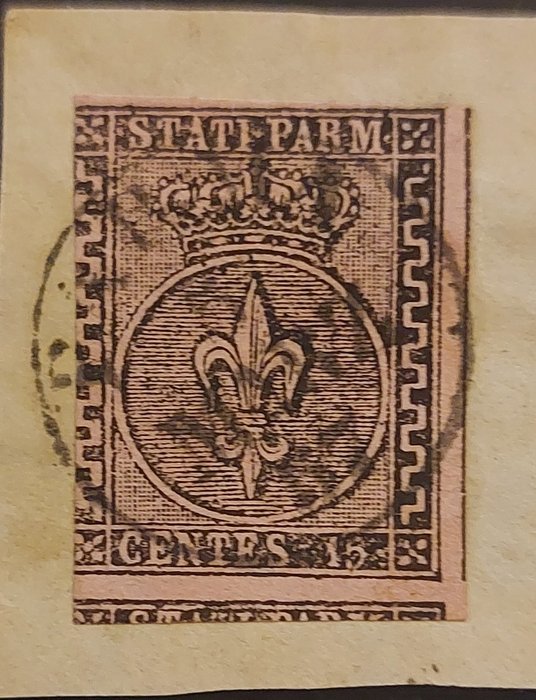 - 15 cent zwart/roze op fragment, gestempeld "PARMA 5 MARZO 57", met deel van de onderwaarde en rechtermarge