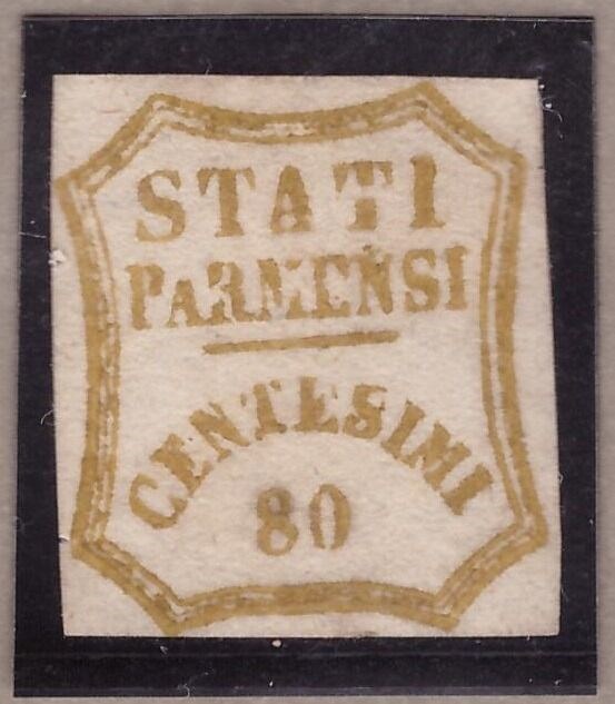 80 cent bistro-olijf, ongebruikt, met gebreken van de stereotypen "AT" van STATEN en "ARME" van PARMENSI.