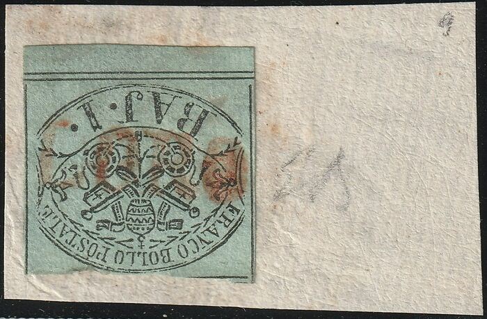Italiaanse oude staten - Pauselijke Staat 1852 - 1st issue, 2 b. azure green used on cut out with SD red cancellation of Loro, rare, with expert’s - Sassone n.2a