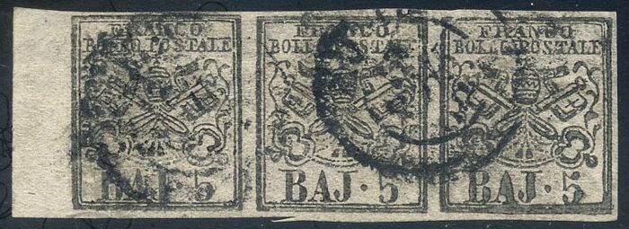 Italiaanse oude staten - Pauselijke Staat 1852 - 5 baj bianco rosaceo, striscia di 3 esemplari con stampa oleosa - Sassone N. 6Ab