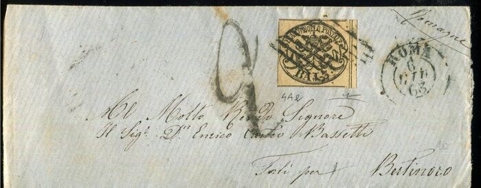 Envelop van Rome 6 juni 63 naar Bertinoro, gefrankeerd tot aan de grens met 3 baj en belast tegen 20 cent voor het Italiaanse grondgebied. Fris samen met goed gemargineerde zegel. Dr. Massimo Manzoni certificaat. Catalogus € 975,00+