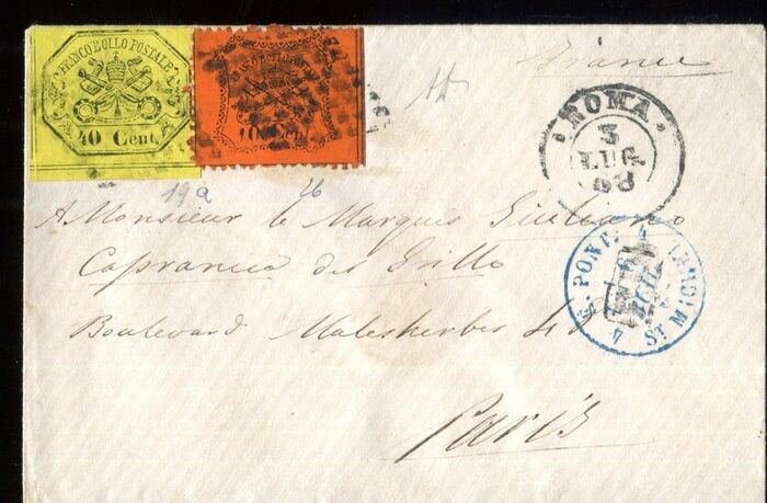Envelop van Rome naar Parijs, gefrankeerd tegen het "PD"-tarief met 40 cent niet geperforeerd, rand van het vel onderaan en zonder punt achter het cijfer samen met 10 cent gekerfd. Invoerstempel op de voorkant. Uitstekend en interessant samen. Handtekening A. Diena. Catalogus € 1400,00++