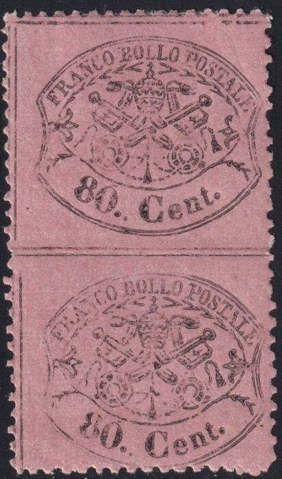 Italiaanse oude staten - Pauselijke Staat 1868 - III^ Em. 80 c. rosa lillaceo coppia verticale Non Dentellato al centro molto rara periziata - Sassone n.30r