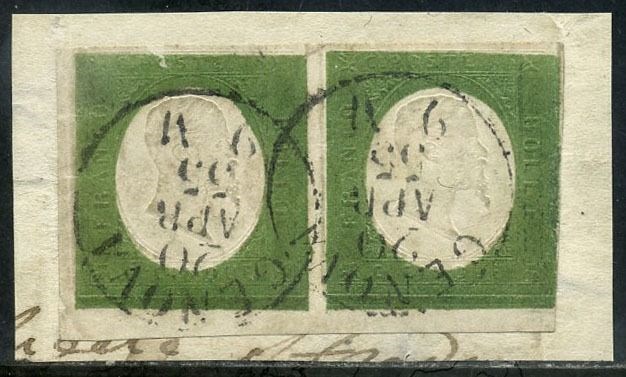 Italiaanse oude staten - Sardinië 1854 - Victor Emmanuel II, 5 c. olive green. Pair on cut out. With certificate. - Sassone N. 7c