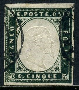 Italiaanse oude staten - Sardinië 1857 - Victor Emmanuel II, 5 c. dark myrtle green. With certificate. - Sassone N. 13Ab