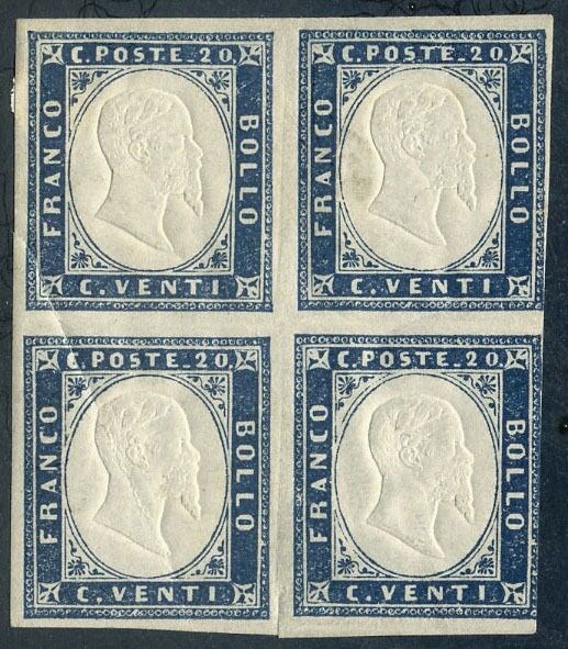 Italiaanse oude staten - Sardinië 186 - Vittorio Emanuele II, 20 centesimi indaco in quartina. - Sassone 15E