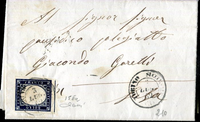 Brief van Novara met tweekleurige frankering. Van Terranova 5 punten naar Volterra. Van Firenze tot Livorno. Van Turijn tot Susa en Vercelli. Uitstekend en fris samen met goed gemargineerde zegels. Handtekening Sorani en Cardillo. Catalogus € 1450,00+ Verzending per aangetekende post met tracking en filatelistische postzegels.
